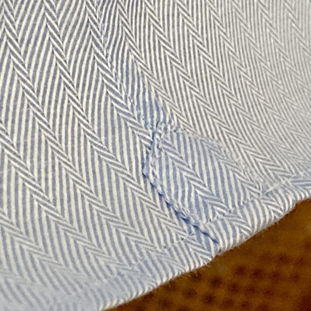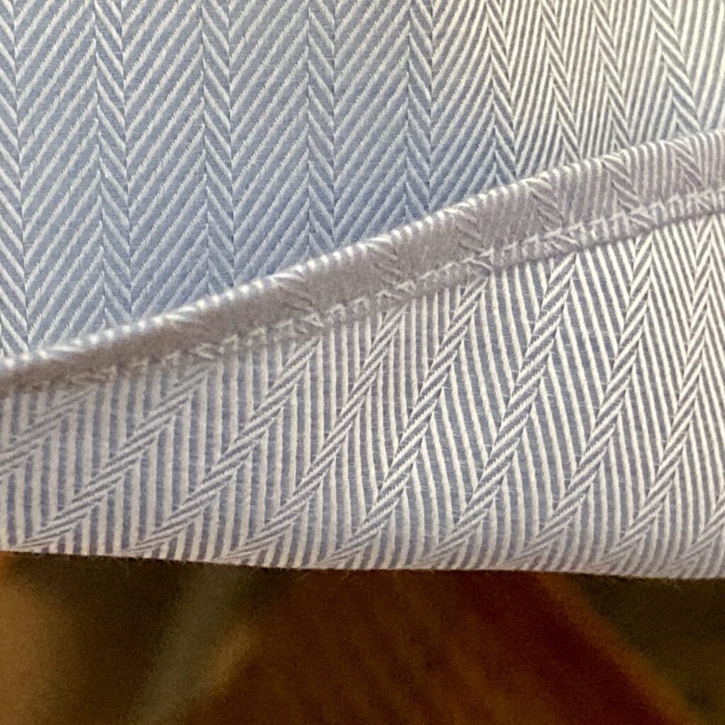 Der Saumstich – eine äusserst feine Naht, die maschinell erfolgt und den Abschluss des Hemden wiedergibt.